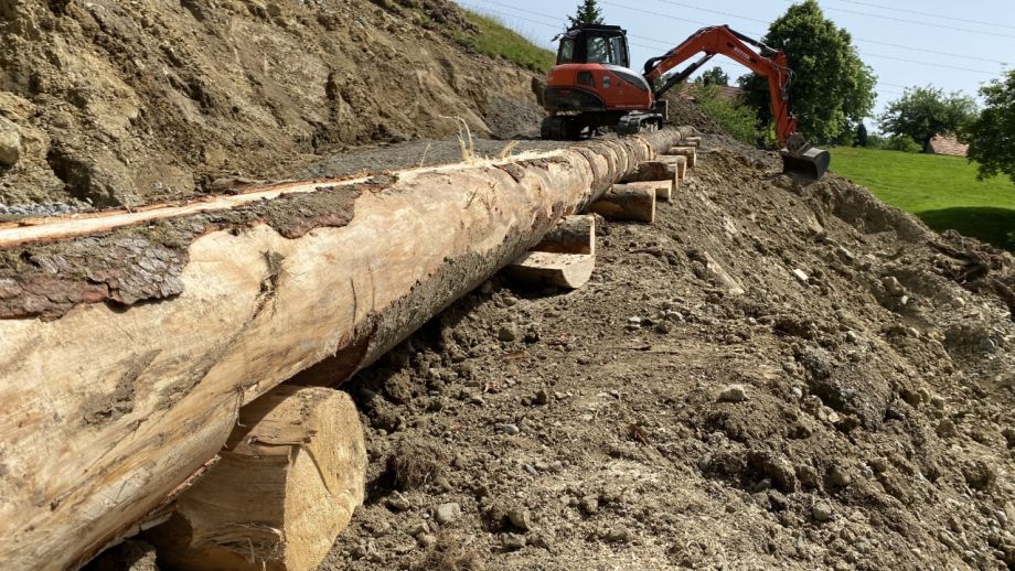 Für Böschungs- und Hangsicherungen oder Bachsperren realisieren wir einfache, kostengünstige Lösungen mit den natürlichen Materialen, Holz und Stein.